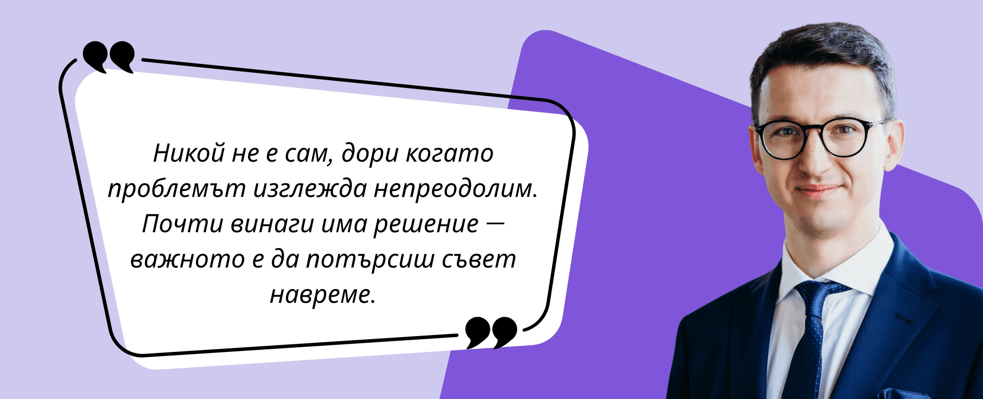 Бих казал, че никой не е сам, дори когато проблемът изглежда непреодолим. Опитът ми показва, че почти винаги има решение. Най-важното е да се направи първата крачка – да се потърси съвет и да се намери информация. Юристите сме тук именно затова – да помагаме да се ориентирате, да разберете какви са правата ви и как може да ги защитите.